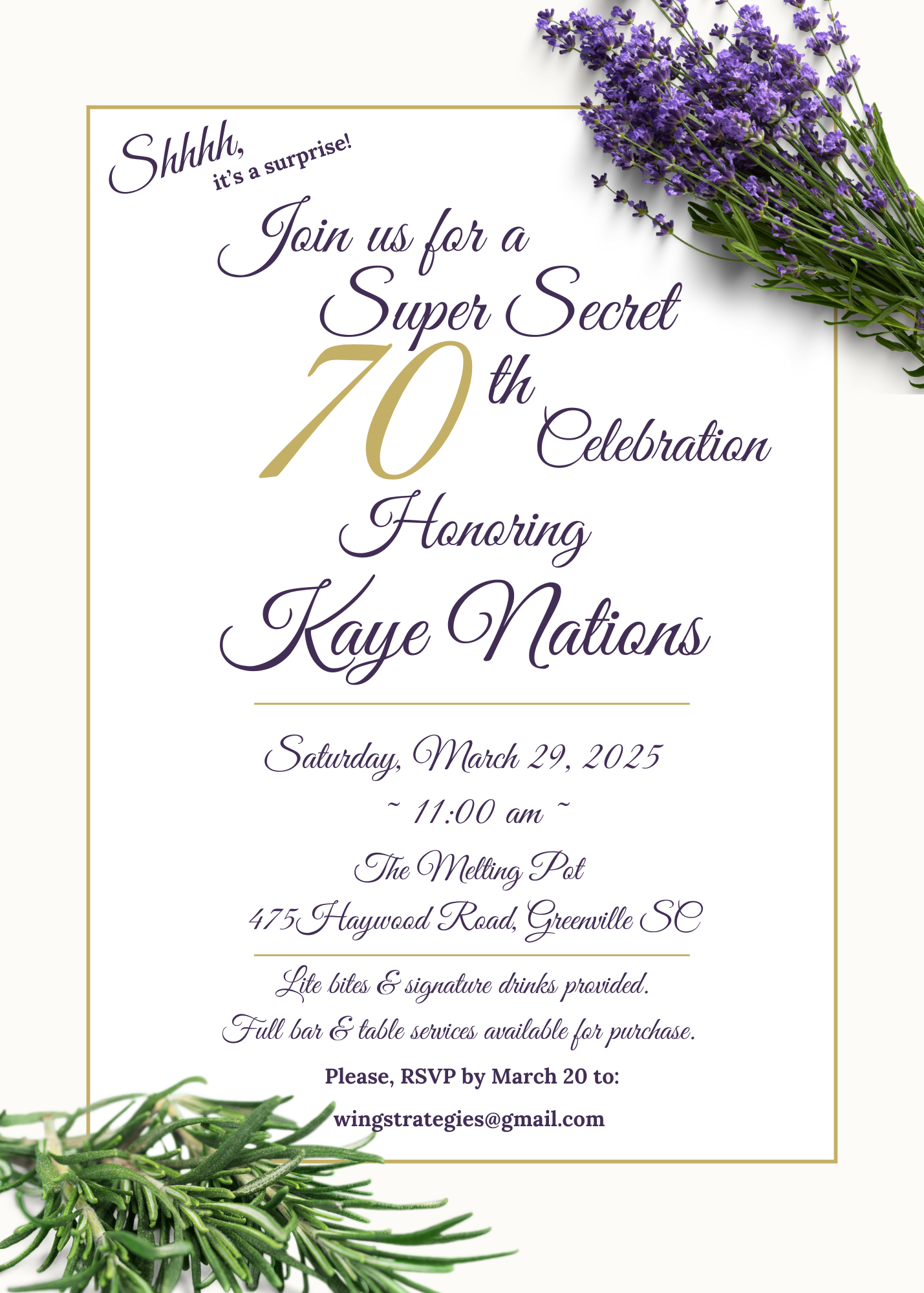 I hope this message finds you well. It is with great excitement and joy that I invite you to a very special occasion honoring a remarkable woman—my beloved mother, Kaye, as she turns 70.